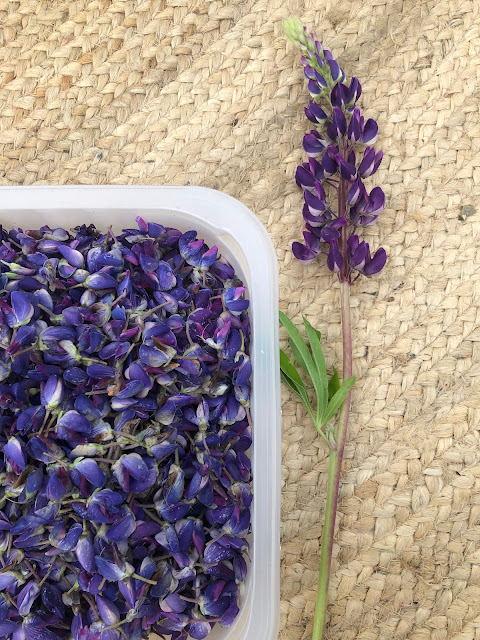 Tämän kesän ensimmäiset värjäykset tein lupiininkukilla. Kukinta alkoi olla lopuillaan ja viimeiset hetket käsillä kokeiluun. Niinpä kävin keräämässä kunnon sylillisen lupiineja ja riivin niistä kukinnot irti.